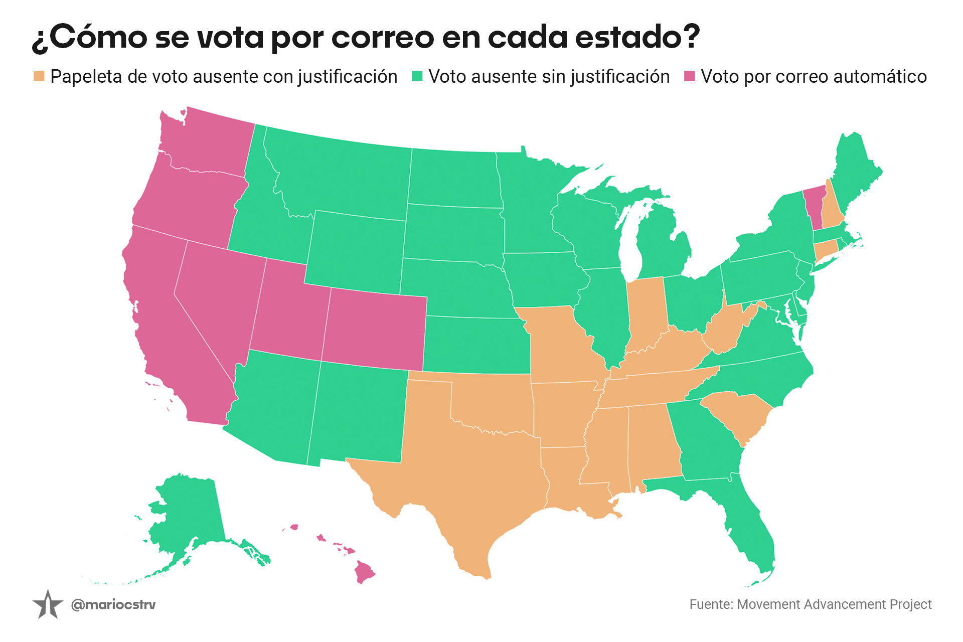 Por ejemplo, en el asunto del voto por correo, los estados se dividen en tres categorías: